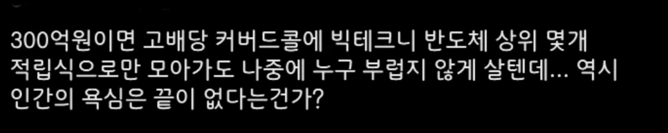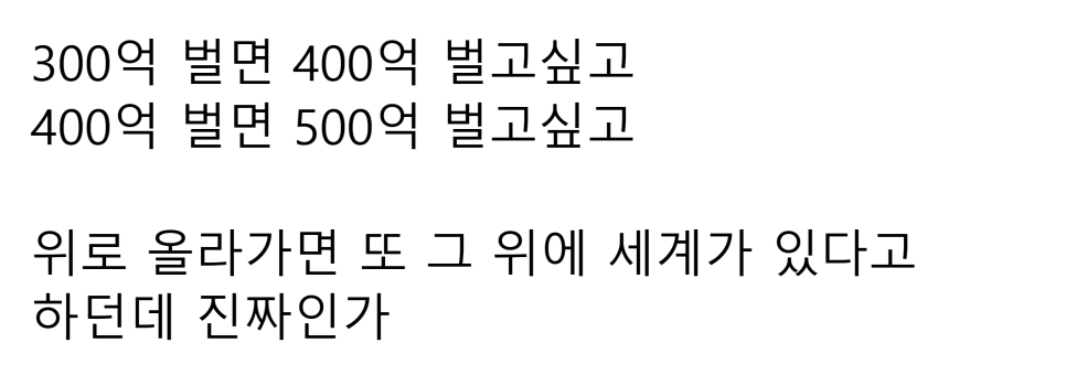 300억 벌면 400억 벌고싶고 다음으로 500억 벌고 싶다.