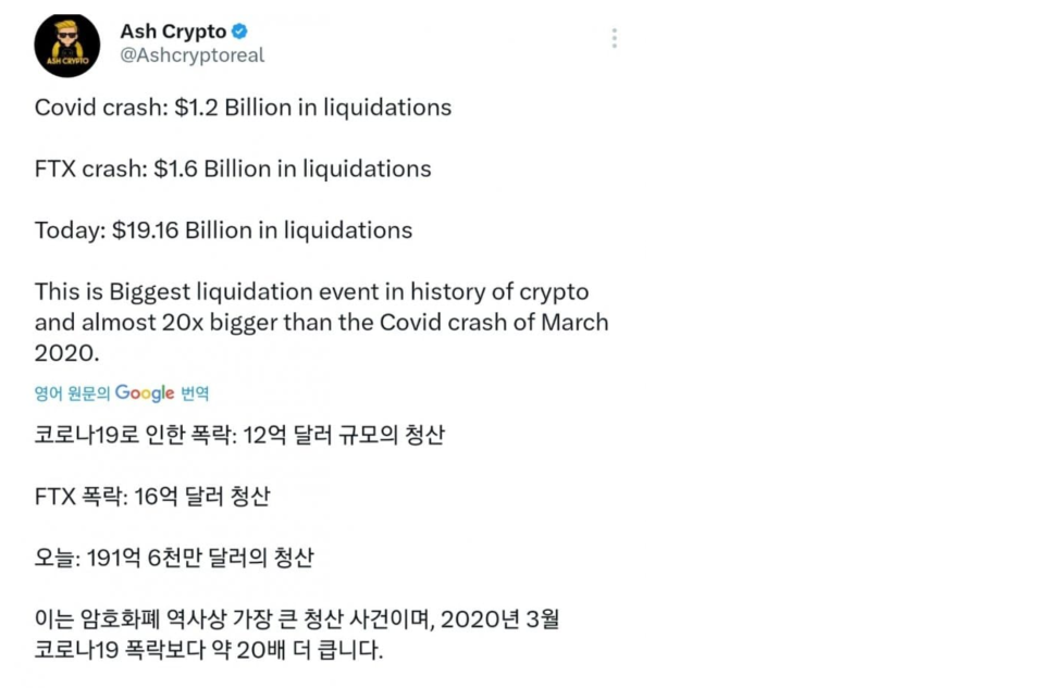 암호화폐 역사사 가장 큰 청산으로 2020년 3월 코로나19 폭락보다 20배 더 크다.