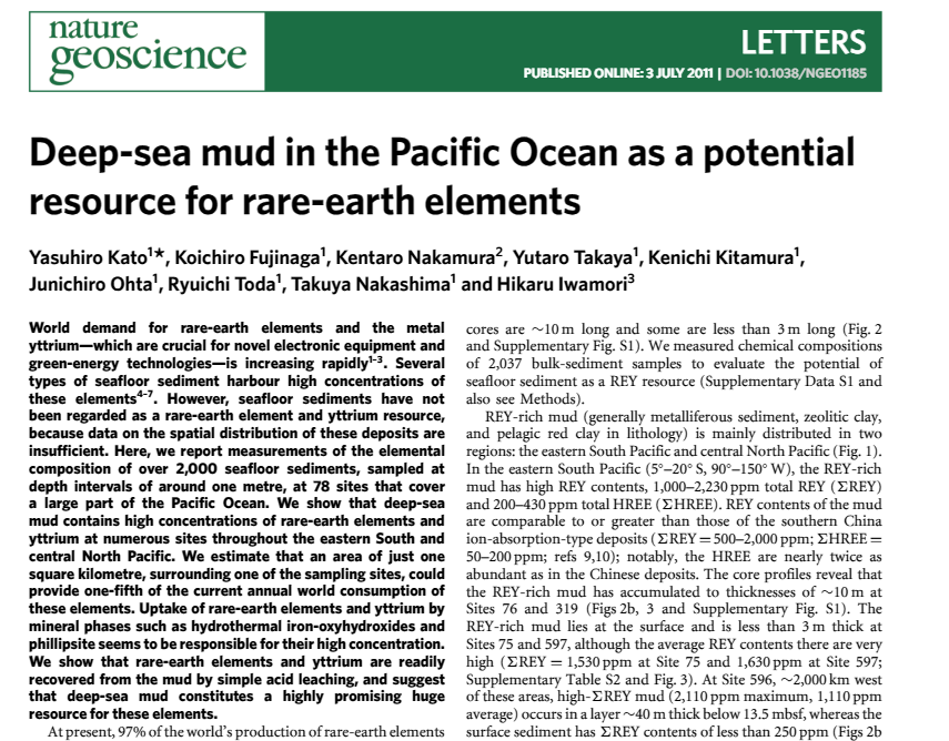 68. 2011년 도쿄대학 연구진은 네이처에 미나미토리섬 인근 해저 진흙에서 고농도의 중희토류(Dy, Tb, Y등)가 발견된 것을 발표함.