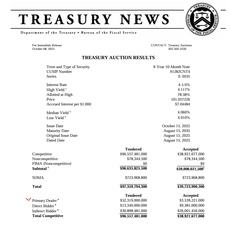 국채가 다 팔리지 않고 남으면, Primary Dealer가 가져가게 계약되어 있기 때문이다.