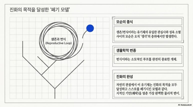 경계가 사라진 유기체에게는 대상이 존재하지 않기에 투사할 상대가 물리적으로 존재하지 않으며, 대상이 곧 자신인 상태에서 성행위라는 설정 자체가 성립 불가능한 논리적 모순이 된다. 자연의 관점에서 이러한 개체는 번식이라는 소모적인 루프를 종료한 생물학적 변종이며, 진화의 목적을 달성하고 폐기된 모델과 같다.