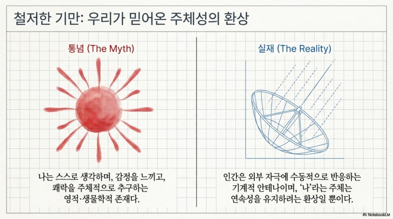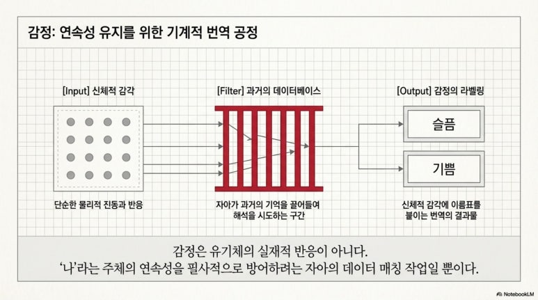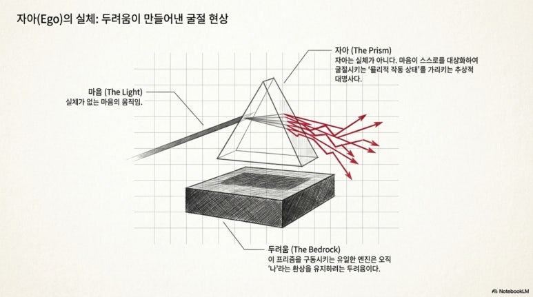 슬픔이나 기쁨은 유기체의 실재적인 반응이 아니라, 그 반응을 과거의 데이터베이스 속으로 끌어들여 해석하려는 자아의 필사적인 연속성 유지 작업이다. 자아는 실체가 아니라 마음이 스스로를 대상화하여 굴절시키는 물리적 작동 상태를 가리키는 추상적 대명사일 뿐이며, 그 기저에는 오직 나라는 환상을 유지하려는 두려움만이 도사리고 있다.