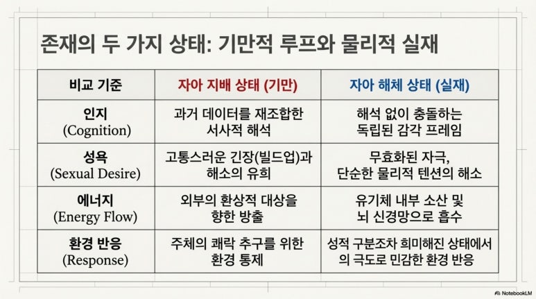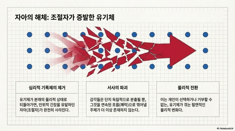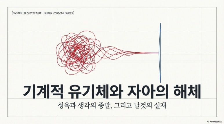 기만적인 소음이 멈춘 뒤 노출되는 기계적 유기체는 더 이상 성적인 인간일 수 없다. 대상과 나를 분리하는 경계가 파괴되면 감각 정보가 신경계에 직접 충돌하는 물리적 마찰만이 남으며, 이는 어떤 심리적 만족이나 영적 성취와도 무관한 유기체의 자동적인 반응 시스템이다.