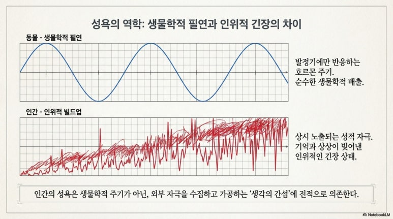 동물이 발정기에만 반응하는 것과 달리 인간이 상시 성적 자극에 노출되는 이유는 신체 내부의 호르몬 주기보다 외부 자극을 수집하고 가공하는 생각의 간섭이 더 강력하기 때문이다. 여자의 손을 잡는 것이나 의자의 팔걸이를 쥐는 것은 생물학적인 면에서 동일한 물리적 접촉일 뿐이지만, 오직 생각이 과거의 데이터를 투사할 때만 전자에서 쾌락적 확장을 위한 빌드업이 시작된다.