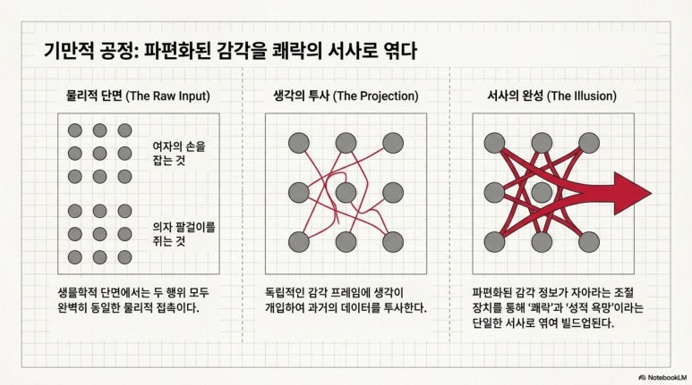 이러한 기계적 인지 시스템에서 성욕은 생물학적 필연성이라기보다 기억과 상상이 빚어낸 인위적인 긴장, 즉 빌드업에 전적으로 의존한다. 인간의 성적 행위는 단순한 생물학적 배출이 아니라, 생각이 개입하여 파편화된 감각 정보를 쾌락이라는 단일한 서사로 엮어내는 기만적인 공정이다.