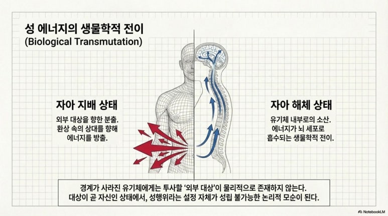 이때 성 에너지는 외부의 대상을 향해 분출되거나 방출되는 대신 유기체 내부로 소산되어 뇌 세포로 흡수되는 생물학적 전이를 겪는다. 이 상태의 유기체는 성적 구분조차 희미해진 상태에서 환경에 민감하게 반응하는 생물학적 실재로만 기능하게 된다. 이는 자아라는 인위적 경계가 무너진 유기체가 겪는 필연적인 물리적 변화이며, 개인이 선택하거나 거부할 수 있는 성질의 것이 아니다.