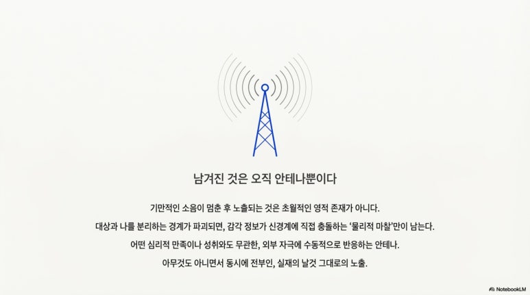 쾌락을 추구하는 주체가 증발한 유기체에게 성은 더 이상 유효한 자극이 아니며, 그저 물리적 텐션의 해소 그 이상도 이하도 아니게 된다. 유기체는 외부 자극에 수동적으로 반응하는 안테나일 뿐이며, 나라는 주체가 감각을 소유하여 쾌락으로 번역하던 모든 시도는 물리적으로 중단된다. 결국 남는 것은 초월적인 존재가 아니라, 외부 자극에 수동적으로 반응하는 안테나이자 아무것도 아니면서 동시에 전부인 실재의 날것 그대로의 노출뿐이다.