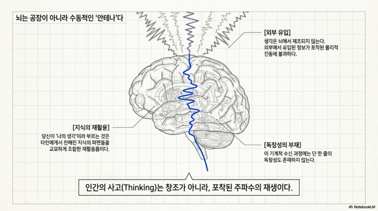 생각은 뇌에서 제조되는 것이 아니라 외부에서 유입된 정보가 뇌라는 안테나에 포착된 물리적 진동에 불과하다. 당신이 나의 생각이라고 부르는 것은 타인에게서 전해진 지식의 파편들을 교묘하게 조합한 재활용품일 뿐이며, 거기에는 단 한 줄의 독창성도 존재하지 않는다. 느낌 역시 생각과 분리되지 않은 동일한 기계적 과정이며, 신체적 감각에 이름표를 붙이는 순간 발생하는 번역의 결과물에 지나지 않는다.